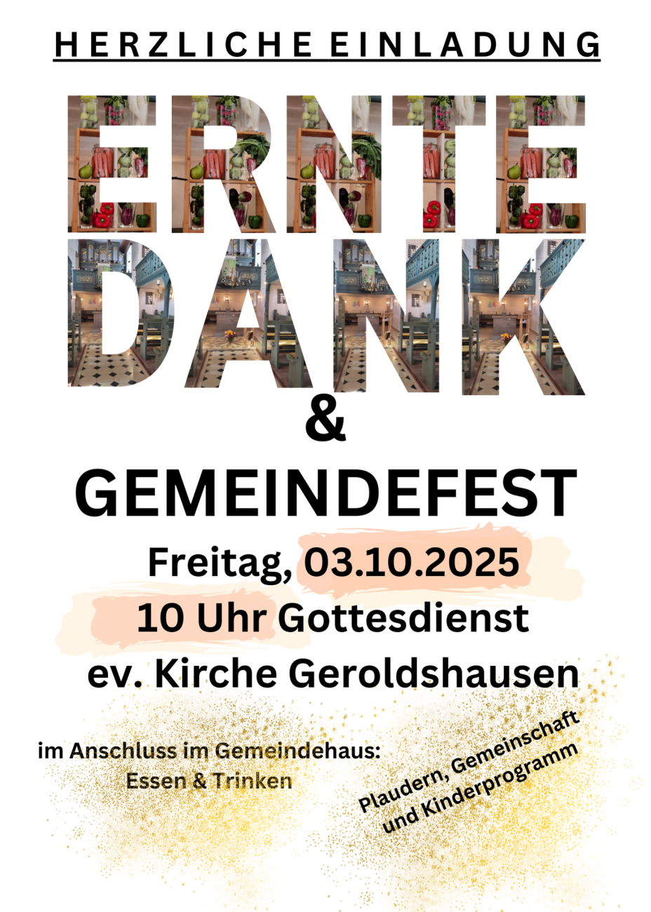 Auch 2025 wollen wir wieder gemeinsam Gemeinschaft feiern. Wir starten mit einem Festgottesdienst um 10:00 Uhr in der evangelischen Kirche Geroldshausen.